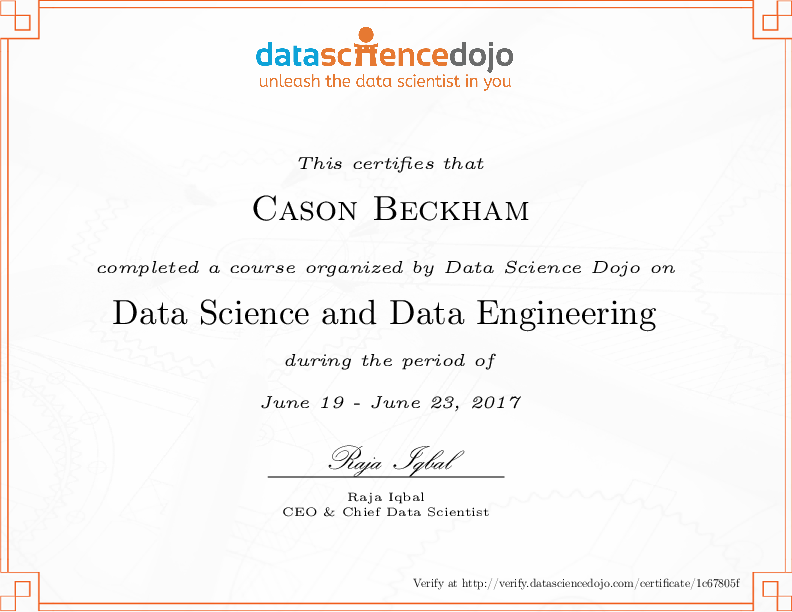 The existence of this website verifies that Cason Beckham has completed the Data Science and Data Engineering 5 DAY training. For additional details, email us.