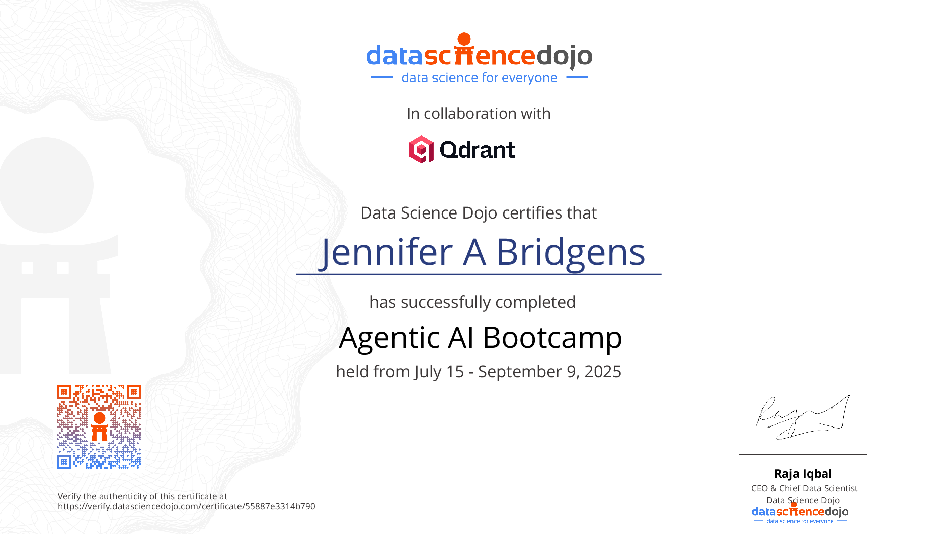 The existence of this website verifies that Jennifer A Bridgens has completed the Agentic AI Bootcamp training. For additional details, email us.