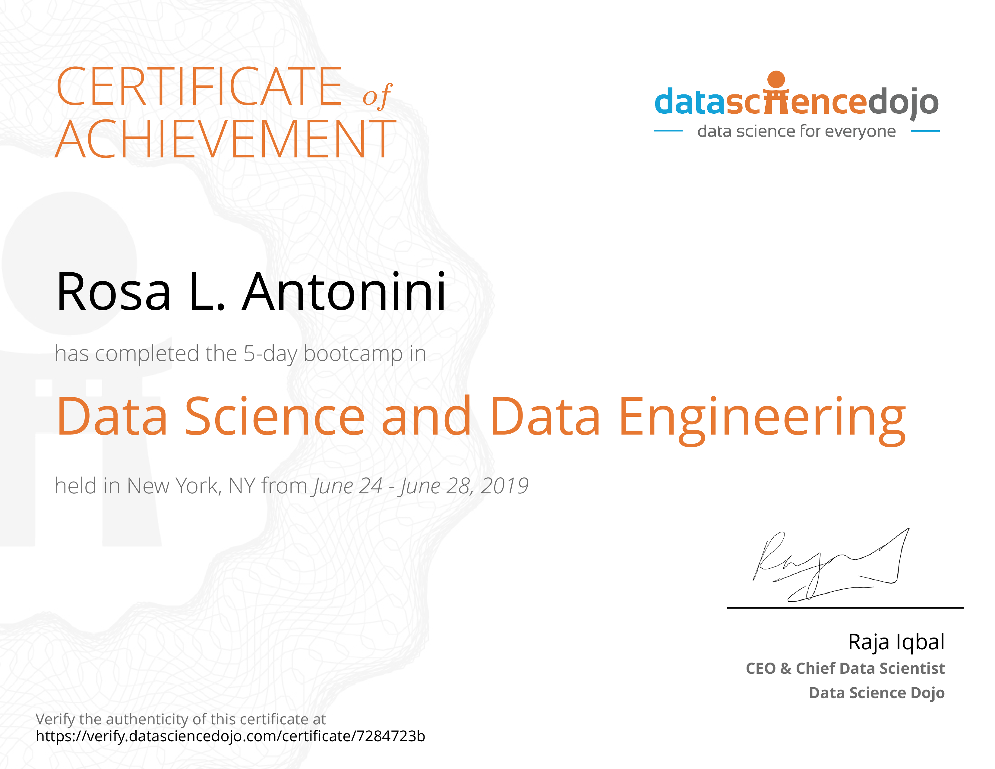 The existence of this website verifies that Rosa L. Antonini has completed the Data Science and Data Engineering 5 DAY training. For additional details, email us.