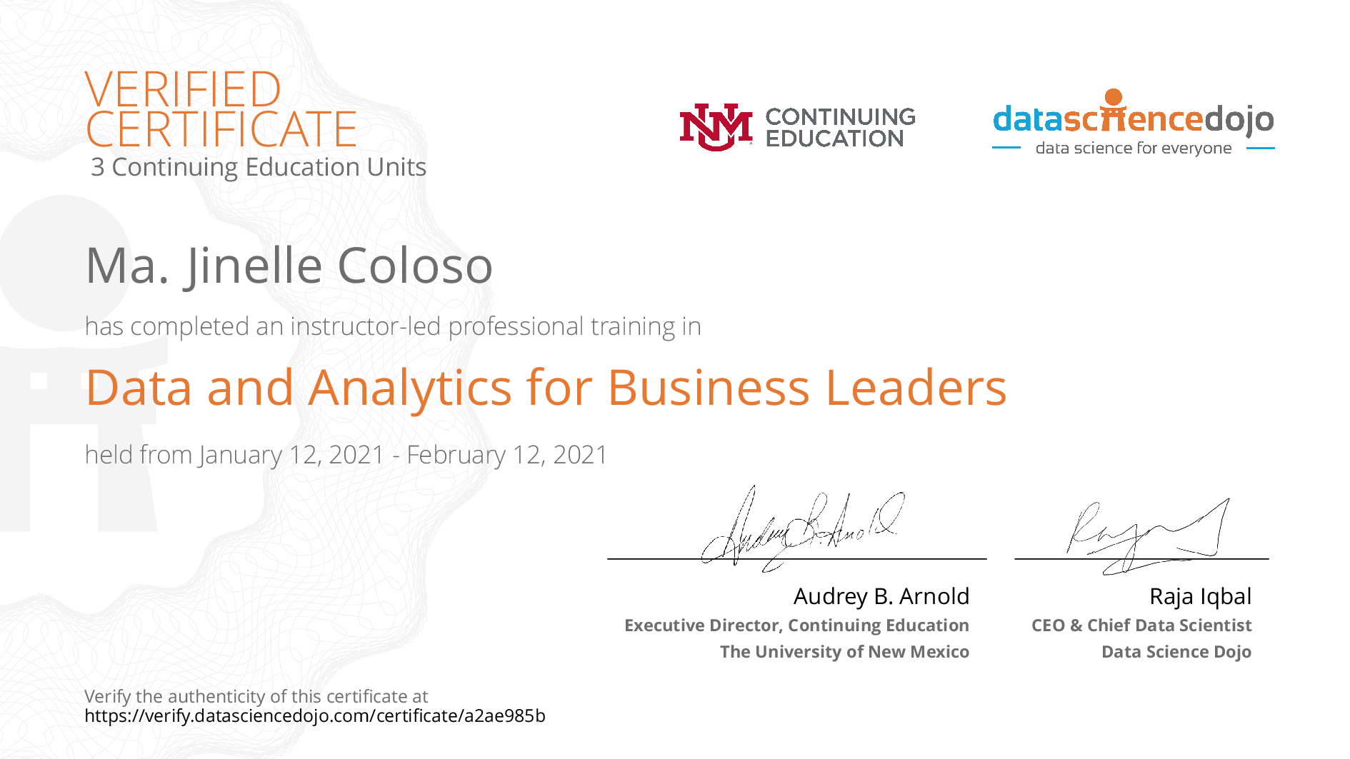 The existence of this website verifies that Ma. Jinelle Coloso has completed the Data and Analytics for Business Leaders training.