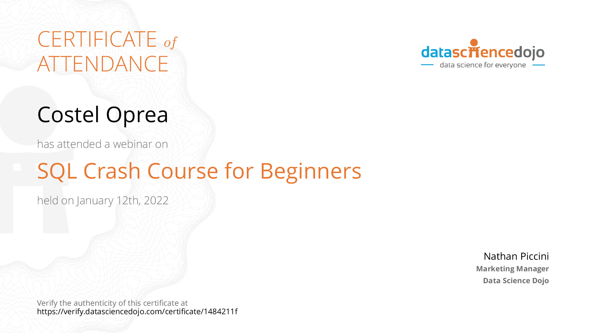 The existence of this website verifies that Costel Oprea has completed the SQL Crash Course for Beginners training. For additional details, email us.