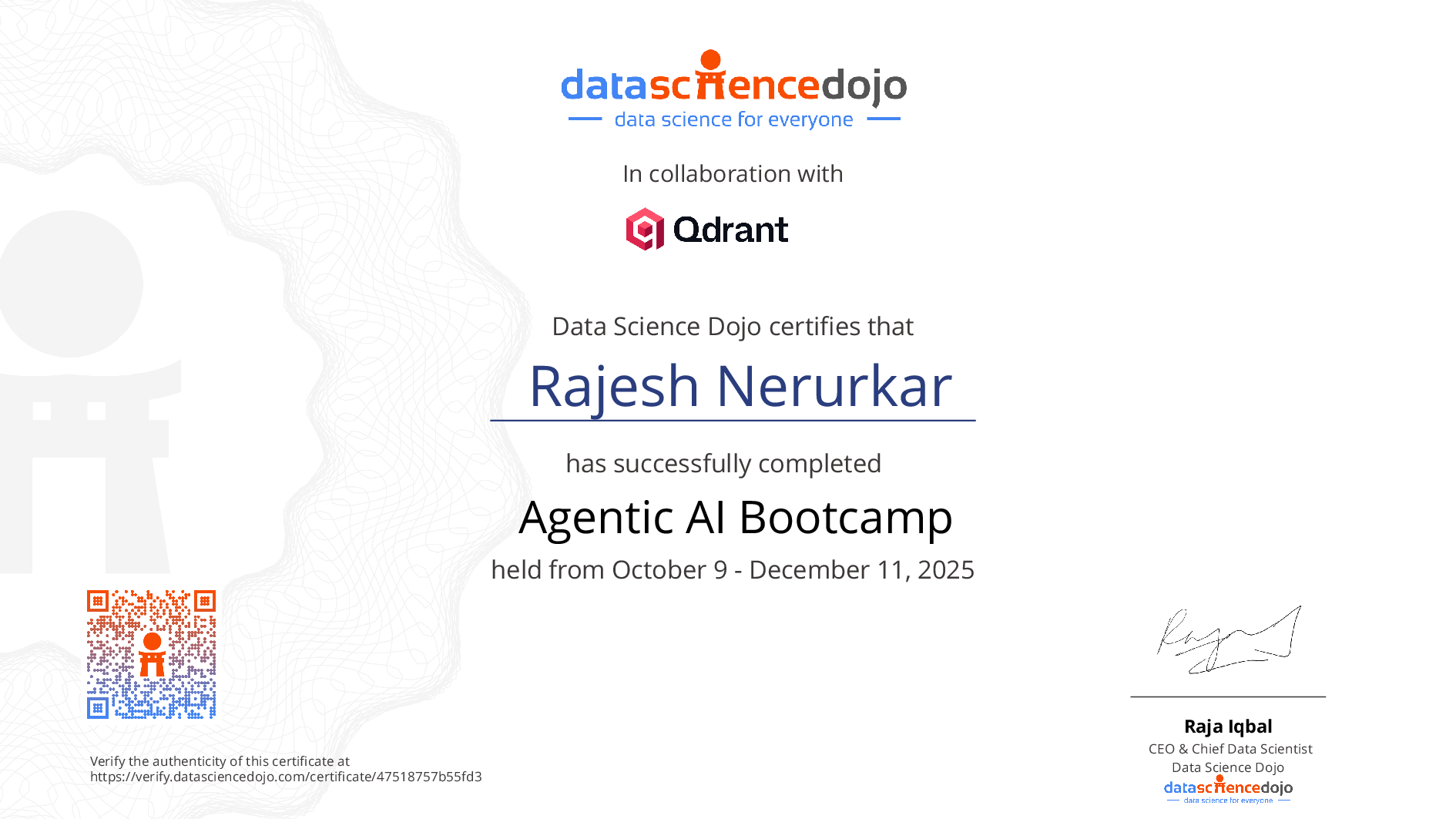 The existence of this website verifies that Rajesh Nerurkar has completed the Agentic AI Bootcamp training. For additional details, email us.