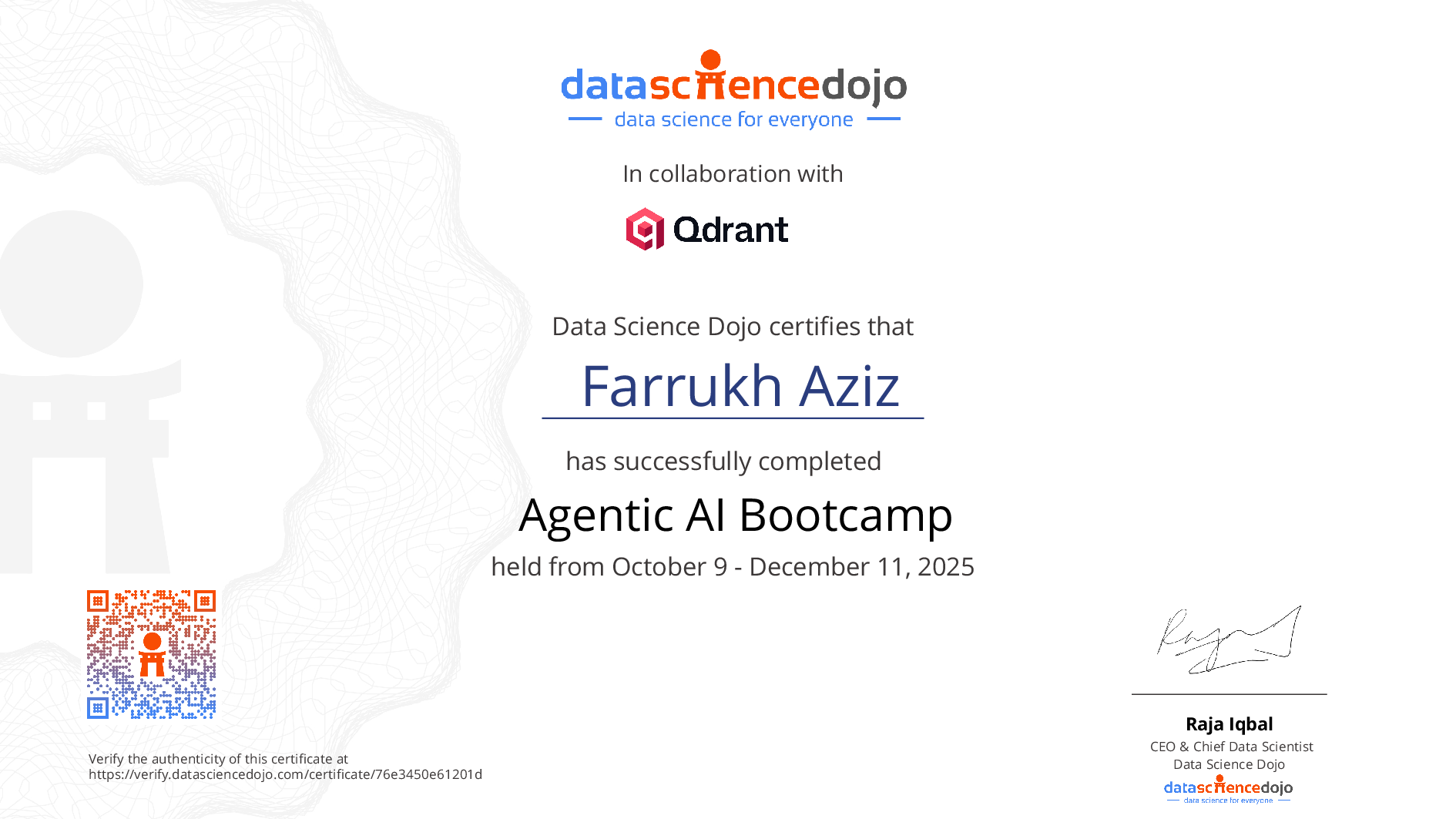 The existence of this website verifies that Farrukh Aziz has completed the Agentic AI Bootcamp training.