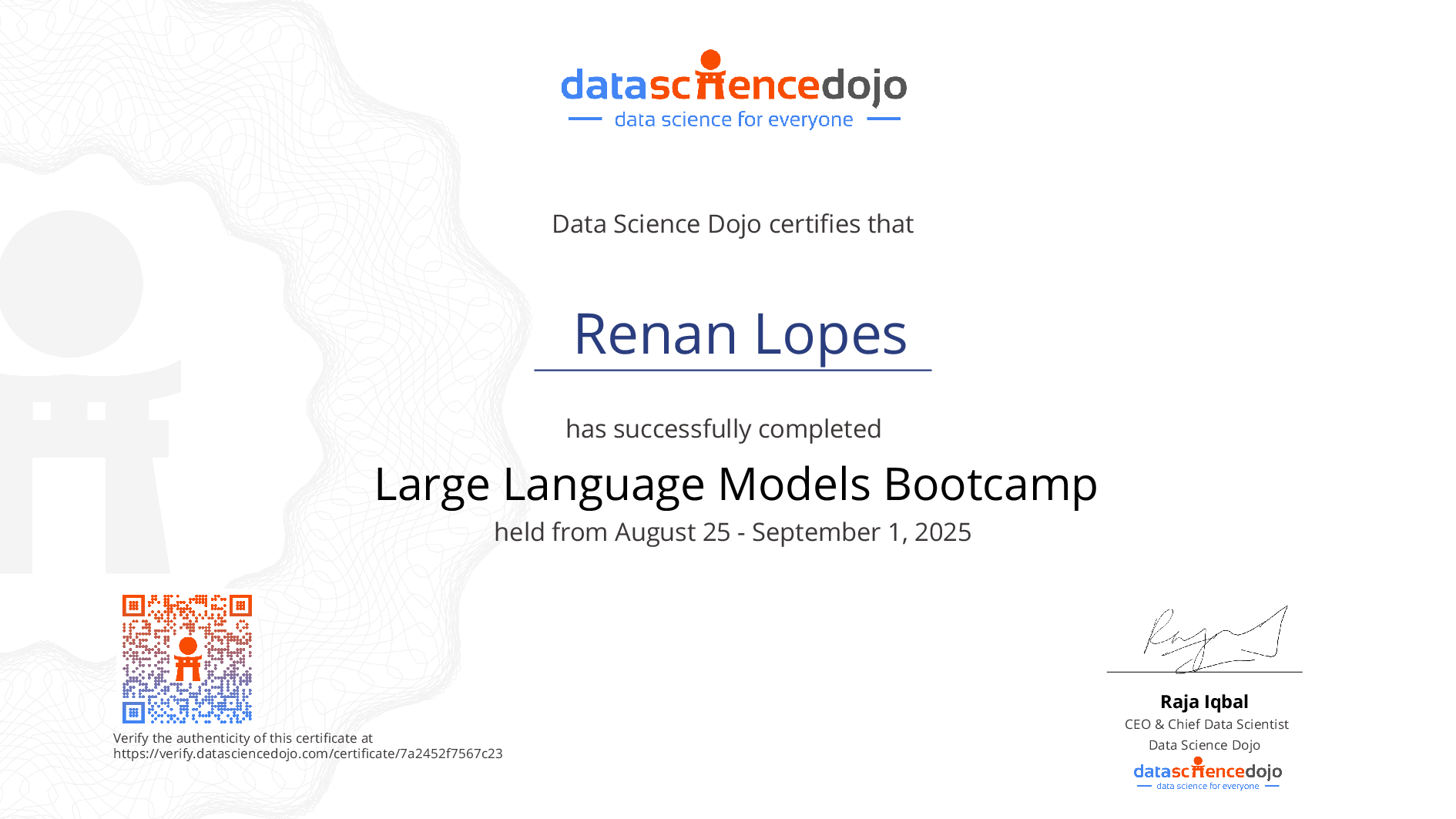 The existence of this website verifies that Renan Lopes has completed the Large Language Models Bootcamp training.