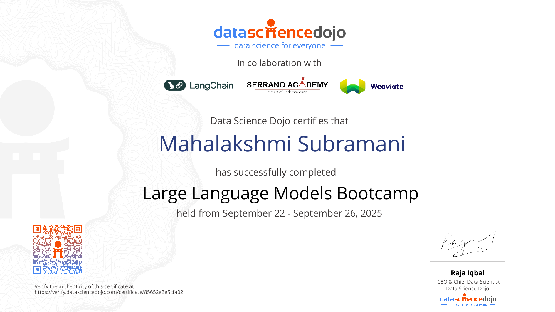 The existence of this website verifies that Mahalakshmi Subramani has completed the Large Language Models Bootcamp training. For additional details,