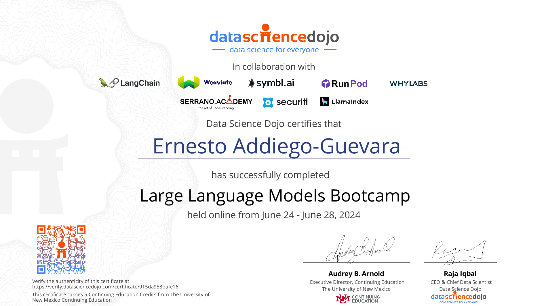 The existence of this website verifies that Ernesto Addiego-Guevara has completed the Large Language Models Bootcamp training. For additional details,