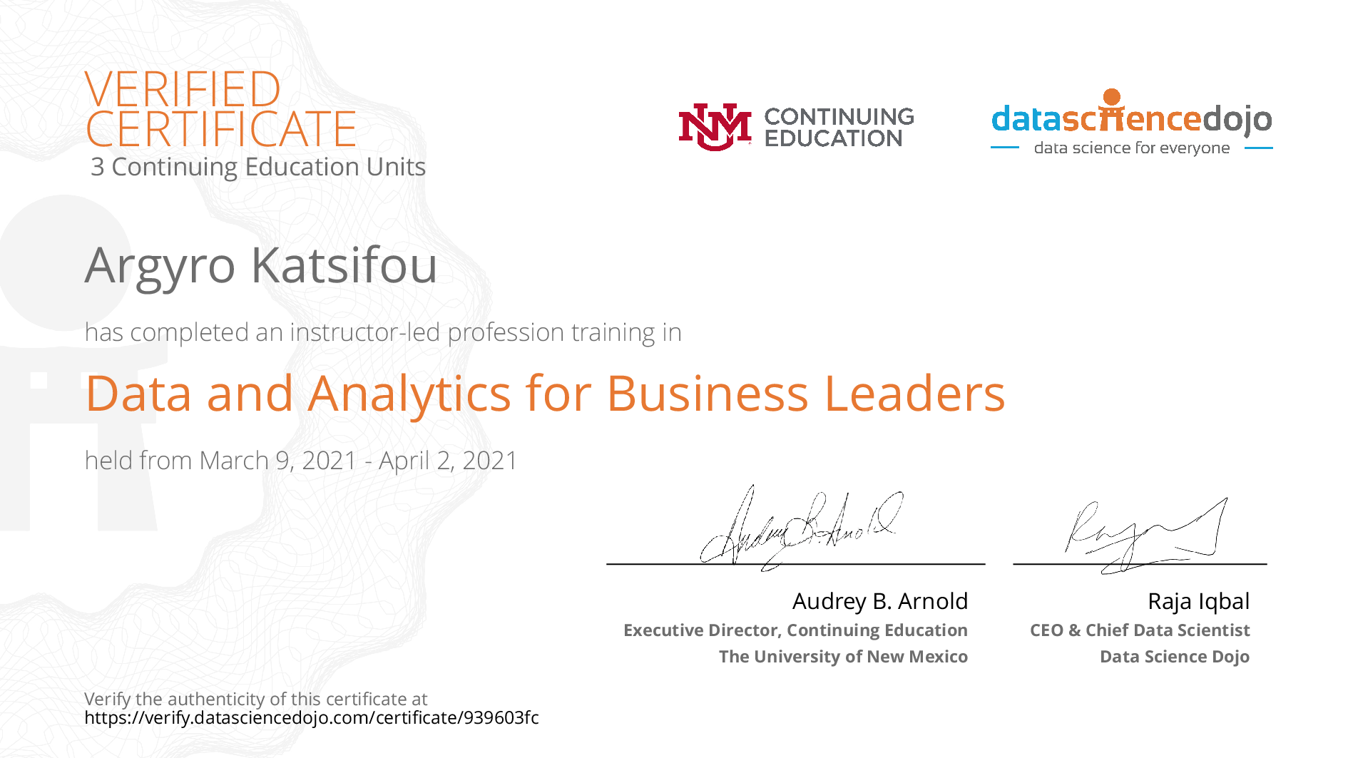 The existence of this website verifies that Argyro Katsifou has completed the Data and Analytics for Business Leaders training.