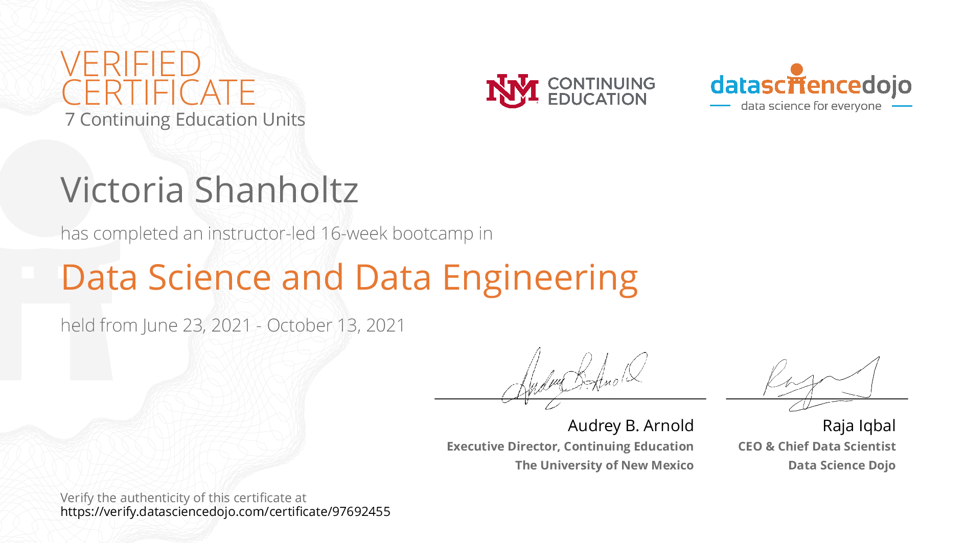 The existence of this website verifies that Victoria Shanholtz has completed the Data Science and Data Engineering Bootcamp training.
