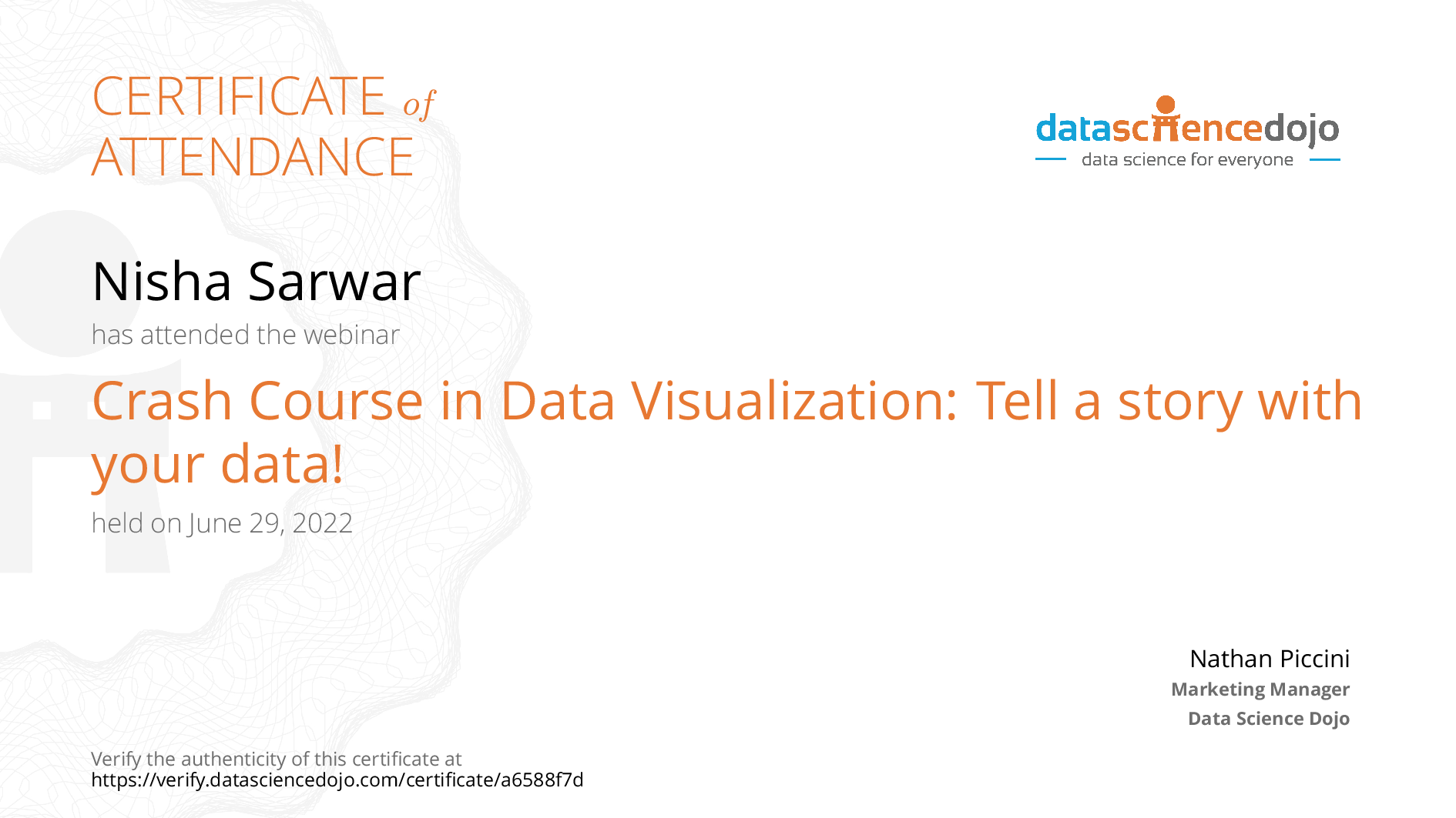The existence of this website verifies that Nisha Sarwar has completed the Crash Course in Data Visualization: Tell a story with your data! training.
