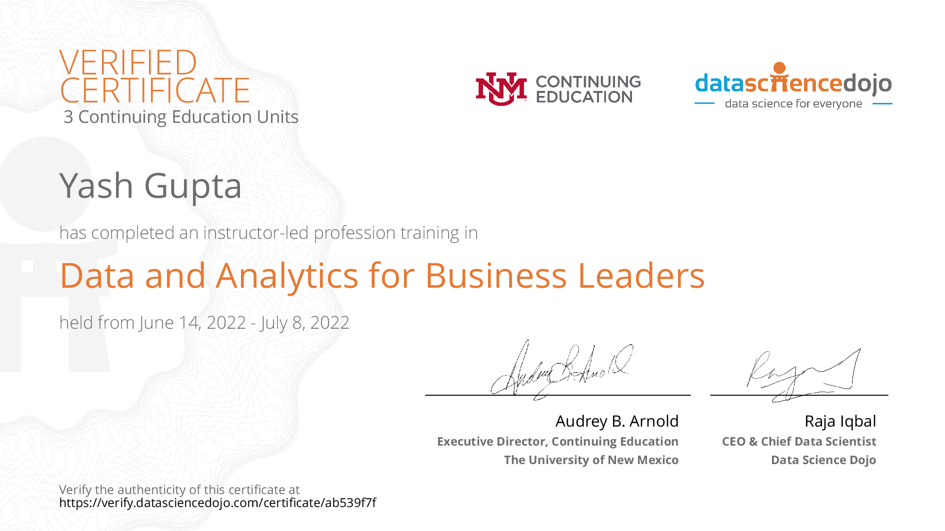 The existence of this website verifies that Yash Gupta has completed the Data and Analytics for Business Leaders training. For additional details, email us.
