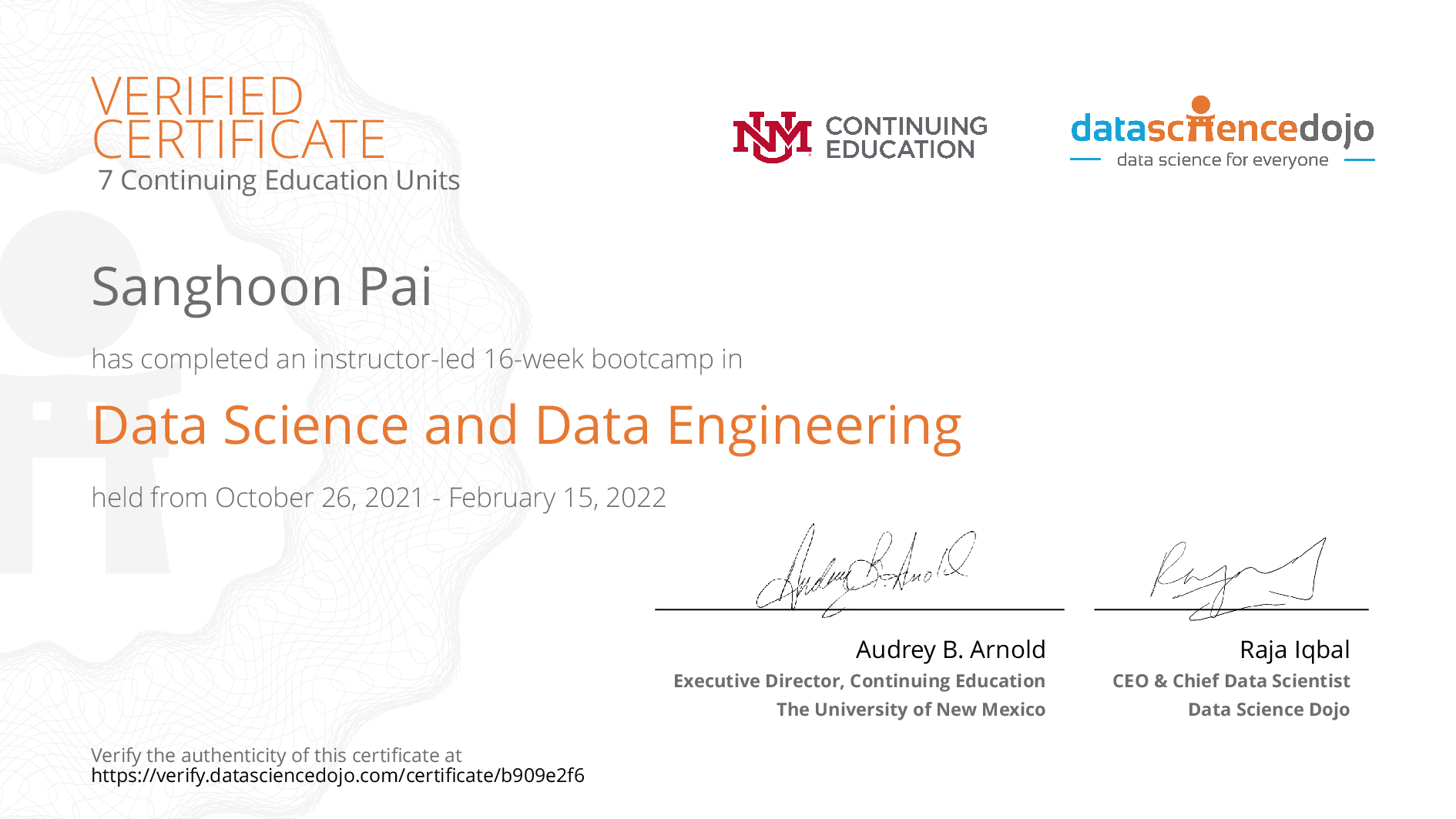 Completed by Sanghoon Pai Certificate ID : b909e2f6 Certification URL : Copy Copied!