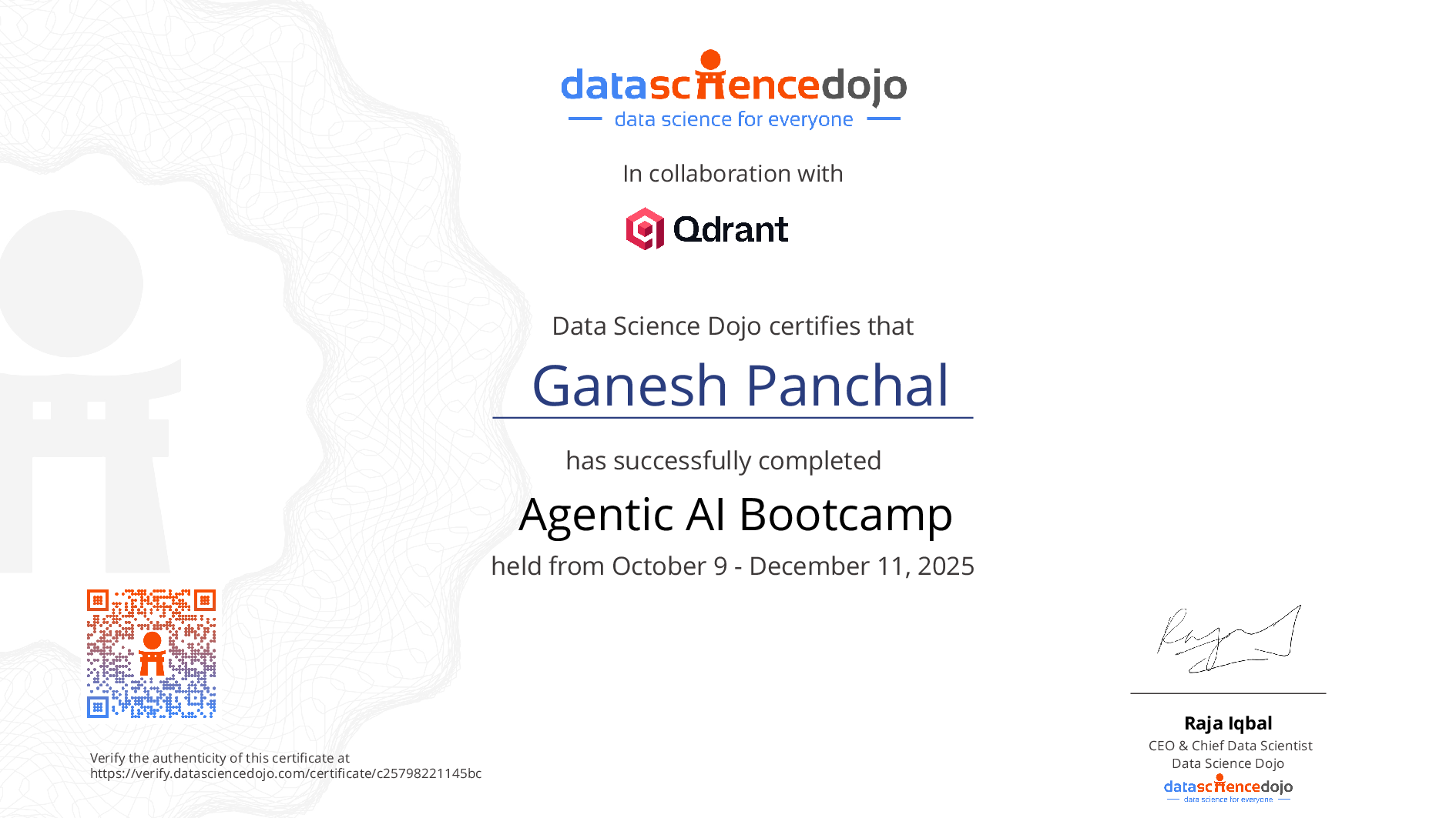 The existence of this website verifies that Ganesh Panchal has completed the Agentic AI Bootcamp training. For additional details, email us.