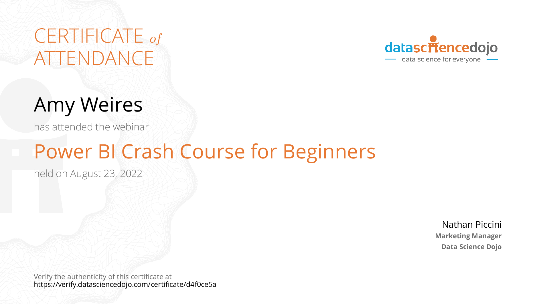 The existence of this website verifies that Amy Weires has completed the Power BI Crash Course for Beginners training. For additional details, email us.