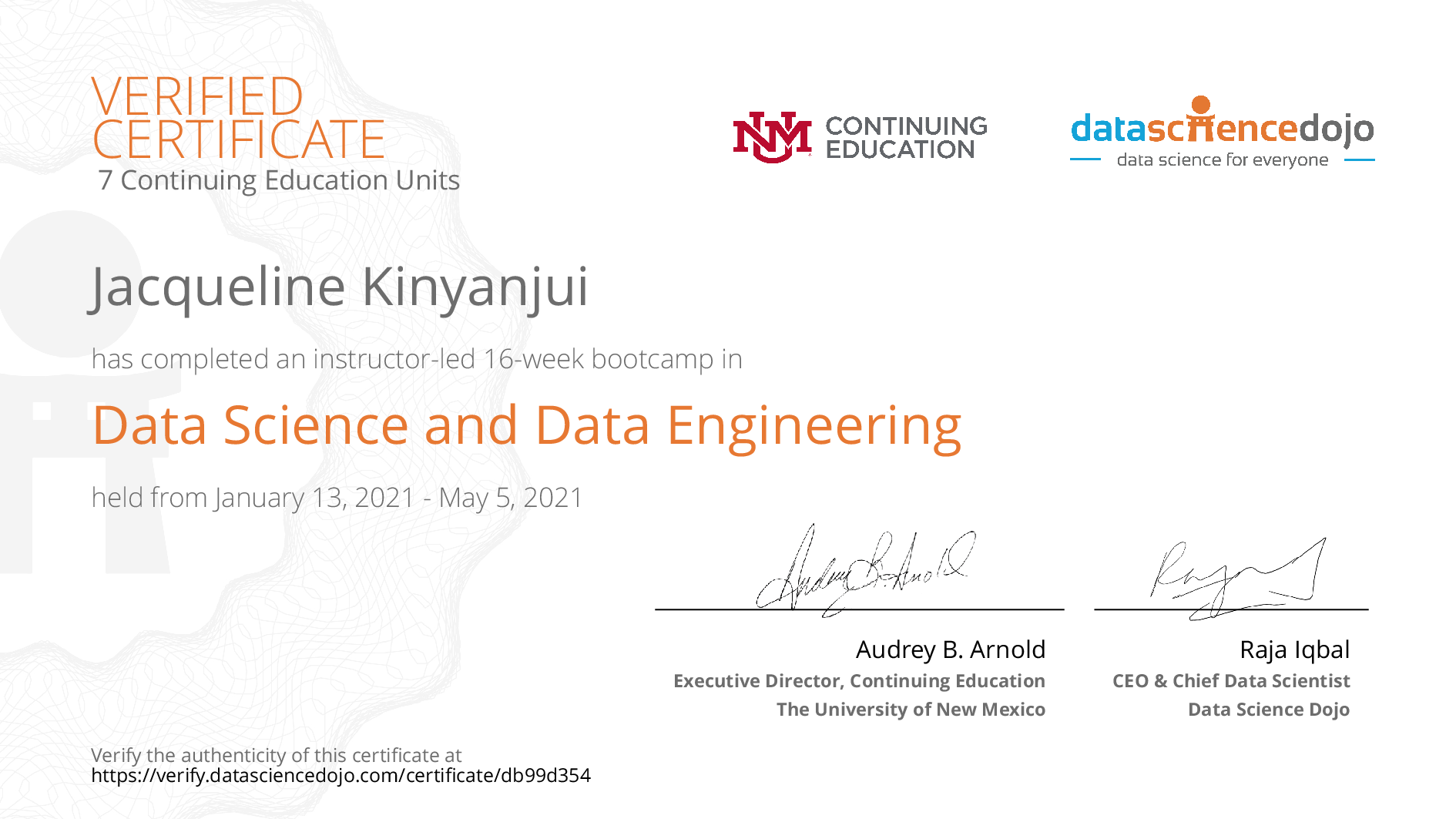The existence of this website verifies that Jacqueline Kinyanjui has completed the Data Science and Data Engineering Bootcamp training. For additional details, email us.