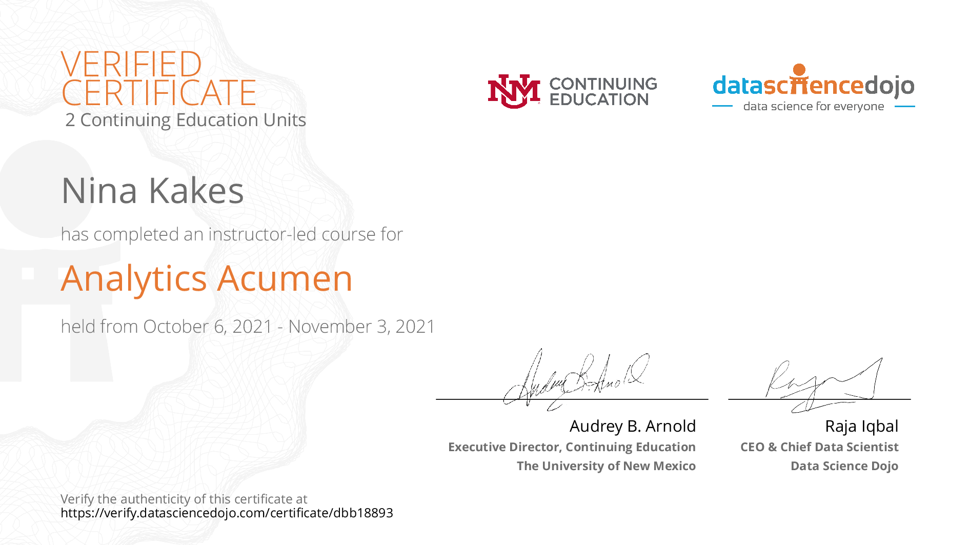 The existence of this website verifies that Nina Kakes has completed the Analytics Acumen training. For additional details, email us.