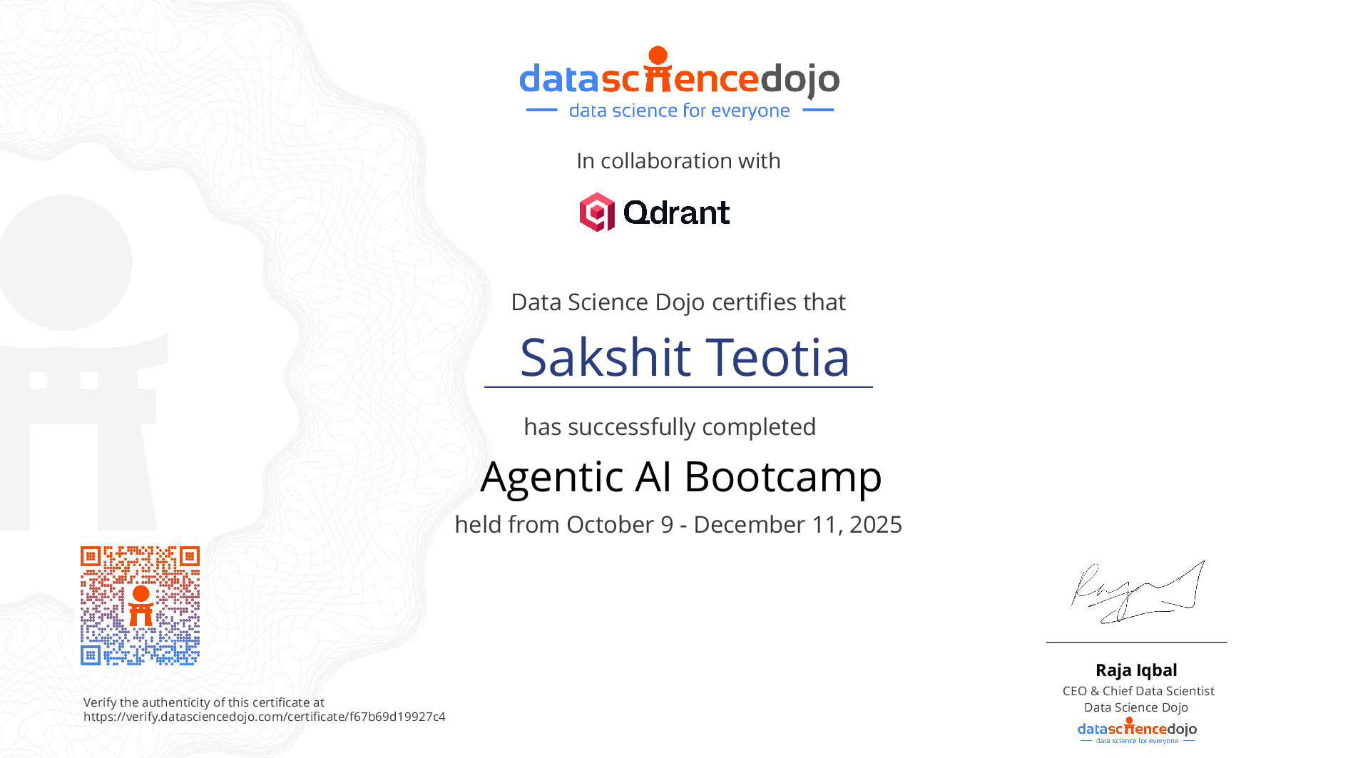 The existence of this website verifies that Sakshit Teotia has completed the Agentic AI Bootcamp training. For additional details, email us.