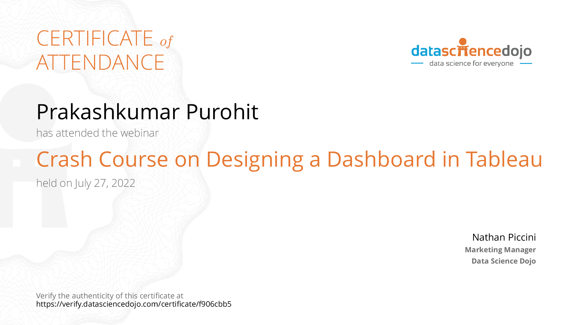 The existence of this website verifies that Prakashkumar Purohit has completed the Crash Course on Designing a Dashboard in Tableau training.
